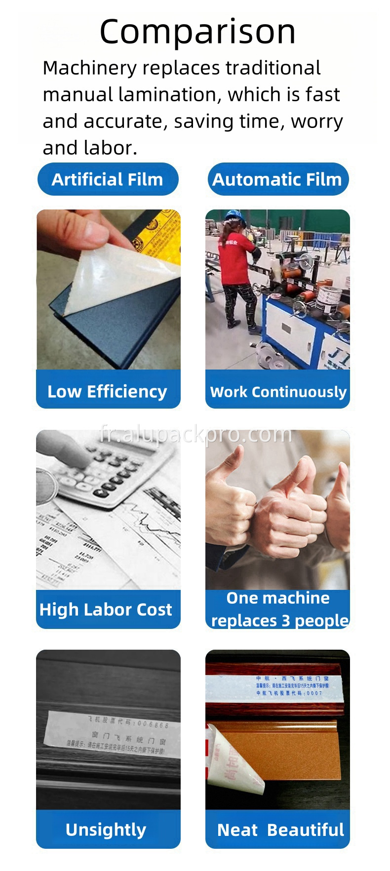 C'est une sorte de machine d'emballage arrière en aluminium, ligne d'emballage de stratification de film protecteur . Le film est apposé sur la surface du profilé pour protéger l'aluminium fini des dommages lors du processus de manipulation, d'inventaire, de transport, de traitement, d'installation, etc. ,l'équipe d'installation l'arrache, laissant la surface aussi propre que neuve.